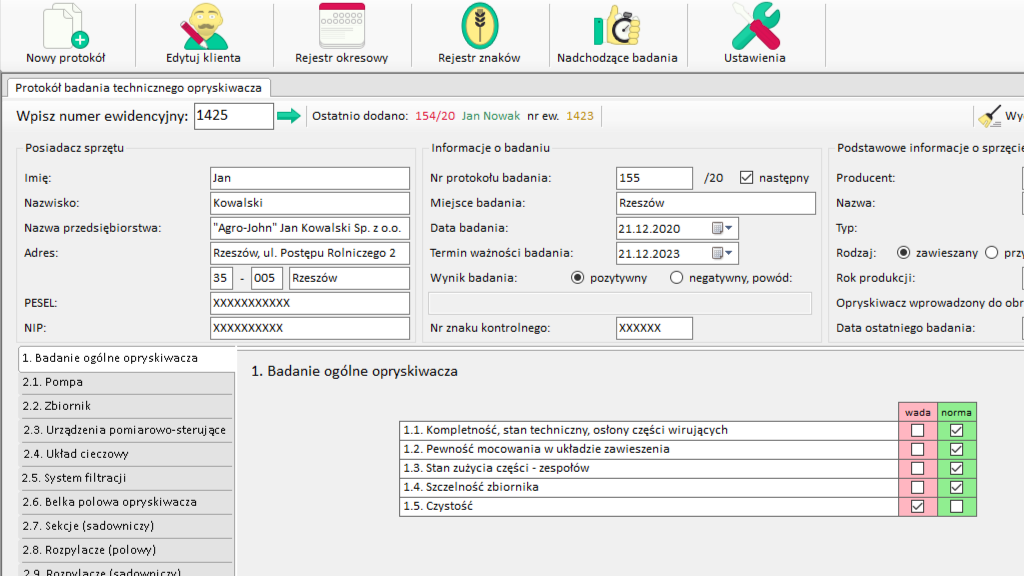 Comprehensive management system for agricultural sprayer inspection station, handling equipment registration, inspection scheduling, and compliance documentation according to PIORiN standards.